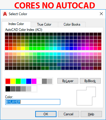 - CORES – você pode escolher entre o padrão do AutoCAD (255 cores), Especificados no estilo de objeto (True Color) ou Especifico na vista (True color).