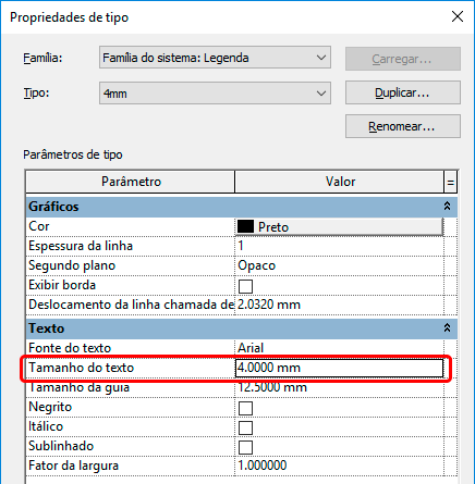 Aqui seria mais interessante trabalharmos com uma fonte de texto maior, porém se você selecionar a Legenda vai observar no campo Propriedades que só temos a opção 2.5mm. Clique em Editar tipo.